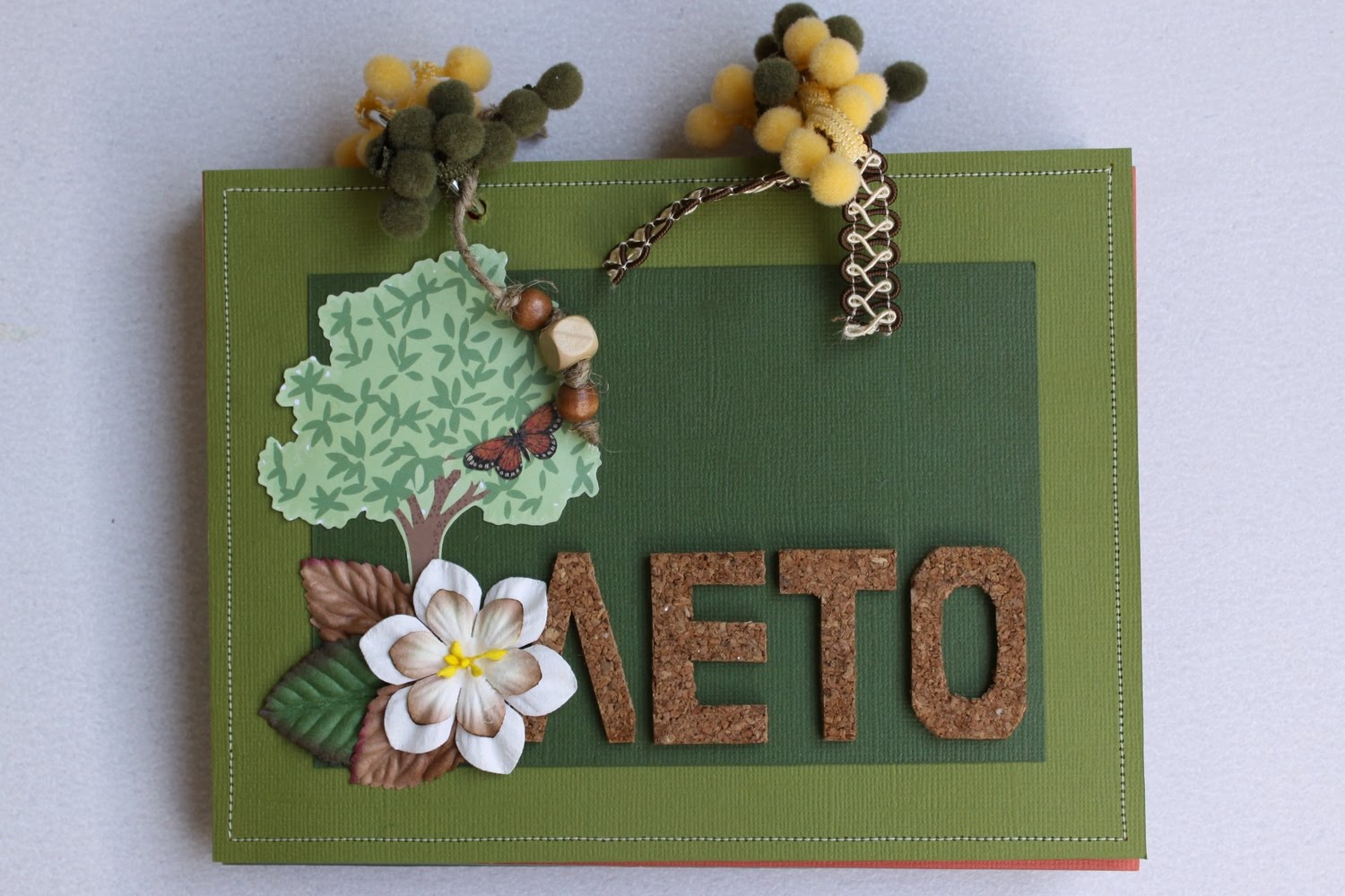 Описание: мини-альбом "ЛЕТО", размер 20*15 см, состоит из 6-ти листов цветного картона с эффектом холста. Вмещает 10 фотографий размером 8*12, украшения - буковки "ЛЕТО" вырезаны из пробки, цветочки, листики, штампики, капли дождя, пуговицы, деревянные украшения, тесемочки, фотографии обработаны по краю мелкой наждачной бумагой, журналинг - детские стихи. Крепление на кольцах сверху.
